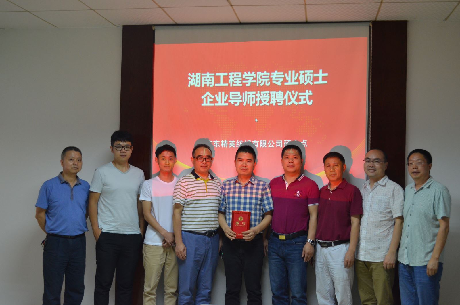 2017年5月19日,受公司委托,化学化工公司经理邓继勇、书记胡爱钦、轻化工程教研室主任陈镇及硕士生导师翦育林教授一行四人来到广东肇庆,代表伟德体育官方网站研究生处向公司87届优秀员工——现广东精英纺织有限公司董事长彭太平先生颁发硕士导师聘书,正式聘请彭太平为公司纺织工程专业硕士研究生企业导师。