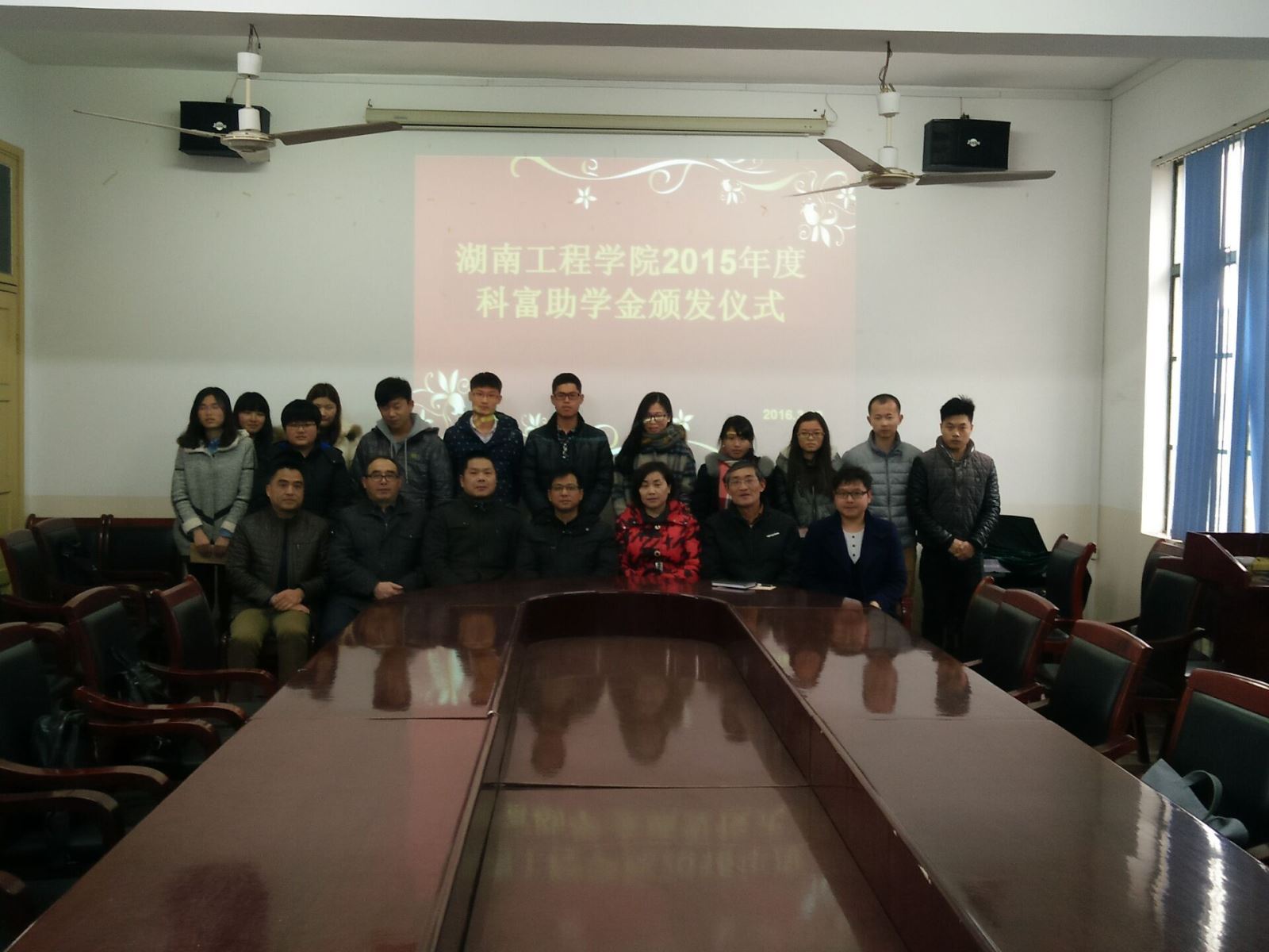 随后张建国宣读了公司2015年科富助学金表彰结果,与会嘉宾和领导为获奖的12名员工颁发了助学金,共计2万元。颁奖会后,袁建新总经理、公司领导与获奖同学合影留念。