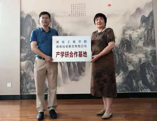 在中国服装(中南)校服研发中心——湖南旭荣制衣有限公司,副总经理蔡建红介绍了公司在我国校服行业领域中的优势与地位和公司的发展规划,并就当前企业发展中急需突破的一些瓶颈进行了深入交流;总经理谢荣介绍了校企双方目前在校服领域合作所取得的成绩,表达了进一步与公司在产、学、研各方面进行全面、长效、深化合作的意愿。会后,易兵与公司总经理谢荣共同为产学研合作基地揭牌。