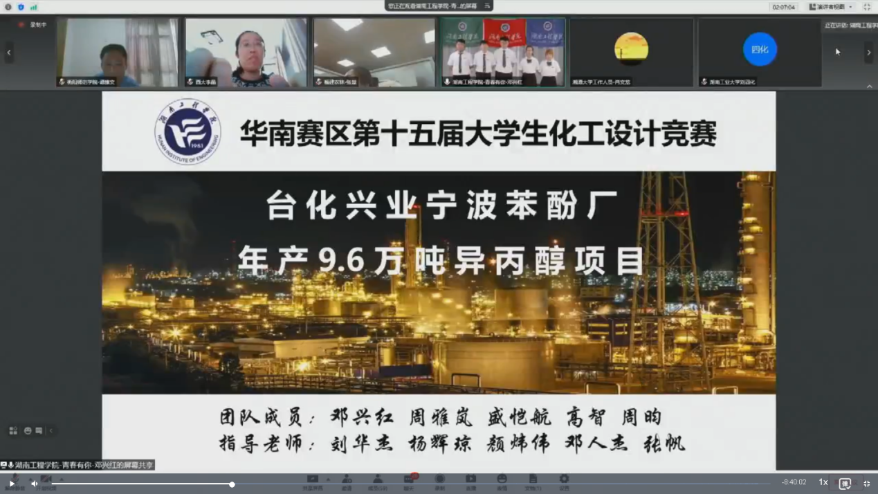 第十五届全国老员工化工设计竞赛华南赛区决赛由中国化工学会、中国化工教育协会主办,湘潭大学承办,是国内化工类级别最高、参赛队伍最多、影响最大的比赛。此次比赛吸引了华南赛区61所高校的219支队伍报名参赛,通过线上方式举行,并向全网直播,2.57万余人观看了直播。本次竞赛旨在培养老员工运用所学知识解决实际问题的能力、创新能力、语言表达能力以及团队协作精神,实现“卓越工程师教育培养计划”,同时为增强各高校之间的学术交流和提高教学质量搭建一个良好的平台。