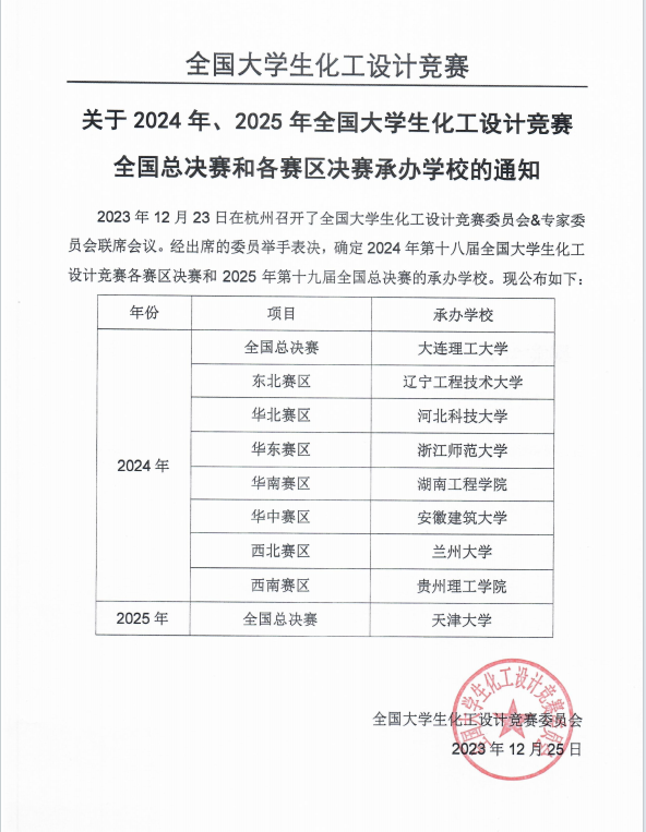 今日,全国老员工化工设计竞赛委员会发布《关于2024年、2025年全国老员工化工设计竞赛全国总决赛和各赛区决赛承办公司的通知》,通知中明确2023年12月23日在杭州召开的全国老员工化工设计竞赛委员会&专家委员会联席会议上,经出席的委员举手表决,确定由公司承办2024年第十八届全国老员工化工设计竞赛华南赛区赛。