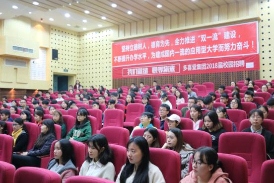 2017年10月16日晚上7:00,多喜爱集团股份有限公司于公司图书馆二报告厅举行2018年校园招聘宣讲会。多喜爱集团人力资源部副总监陈方卉、化学化工公司学办老师刘思博出席此次招聘会,陈方卉担任主讲人。此次招聘会主要面向轻化、纺织工程等多个专业的员工。