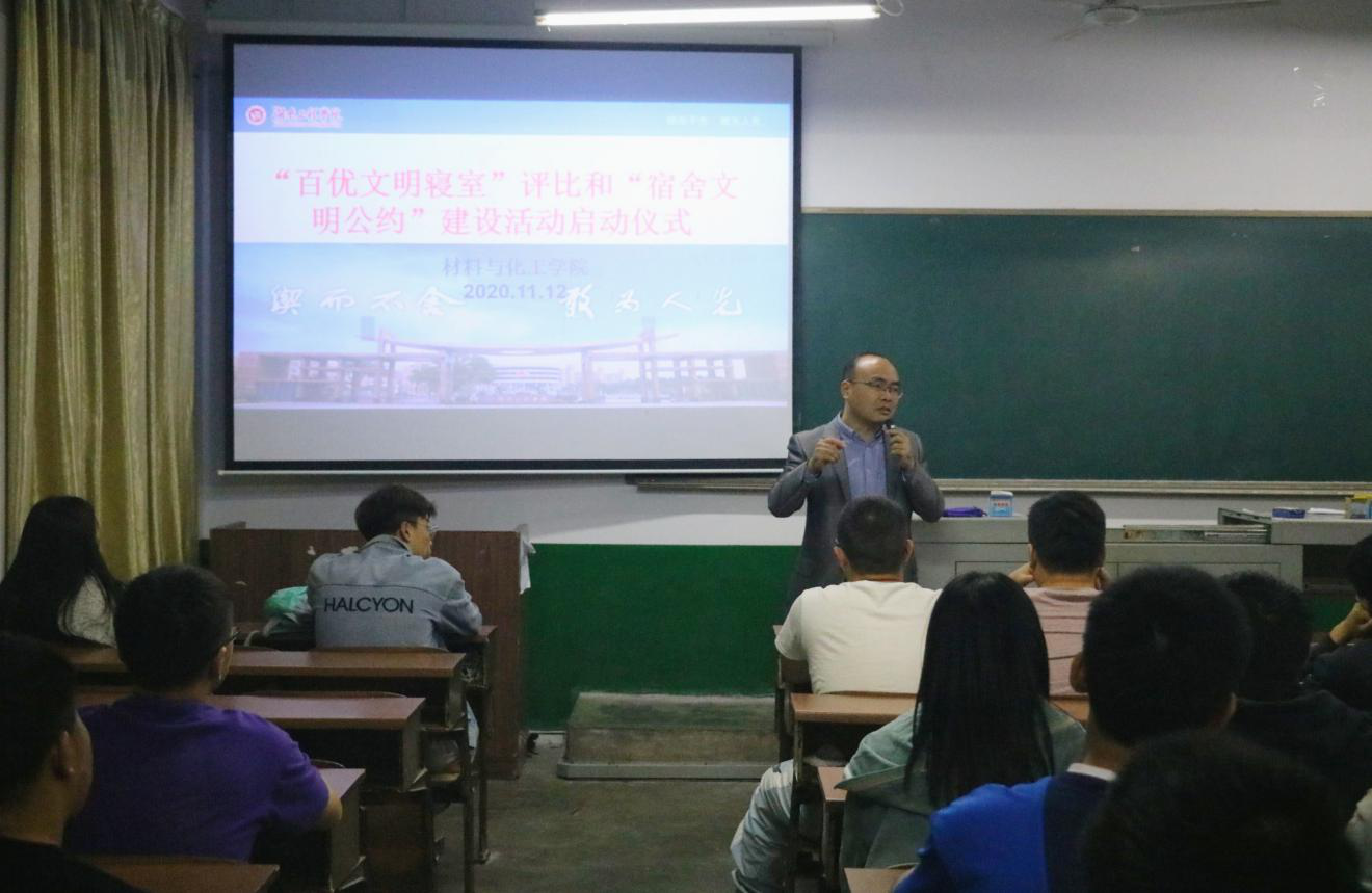 为推动公司寝室文化建设,营造积极向上、舒适优雅、文明礼貌、安全和谐的宿舍文化氛围,11月12日下午,公司在四教209教室召开了百优文明寝室评比和宿舍文明公约建设活动启动仪式暨十一月月讲评。会议由公司辅导员李娥君主持,党委副书记陈镇、学办老师及2019级、2020级寝室长参加了此次会议。