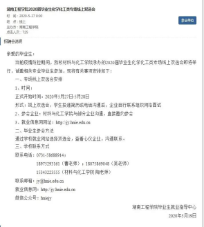 5月27日-28日,公司承办的“2020届毕业生化学化工类专场线上双选会”举行。参会企业近30家,其中不乏央企、上市公司等优质企业,提供就业岗位逾300个。