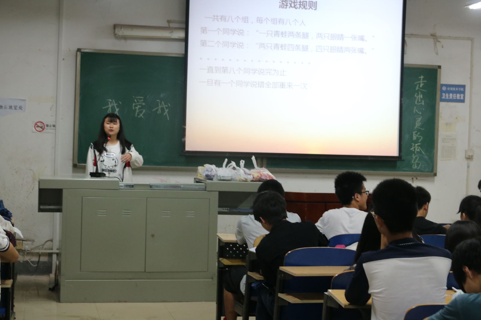 活动以心理委员分享“心理健康”方面知识开始。心理委员将准备充分的资料发放给同学,并对其中列举的极端心理问题进行集体发言讨论。各班心理委员着重强调同学们在学习生活中遇到自身无法解决的问题,可以询问老师或同学,避免由于阴郁积压造成不可挽回的后果。为活跃班级气氛,增强班级凝聚力。各班班长播放精心制作的班级PPT,并向本班同学介绍了班级学习情况、生活小事及班级活动等点滴细节。紧接着,各班在心理委员的带领下观看包括“复旦投毒案”等有关老员工心理问题的新闻报道,许多同学在观影后都表示将正视心理问题,妥善处理同学之间的交往。观影后,材料1501班组织开展了“猜猜室友或同学喜好”等拉近沟通的小游戏,使同学们在轻松的氛围中放松紧张的心情。化工1501与化工1502班利用制作的场景弹幕让同学们宣泄日常生活中的负面情绪,拥抱阳光青春。其他各班都有利用几个趣味游戏拉近同班同学之间的距离,欢声笑语从教室里传出来。