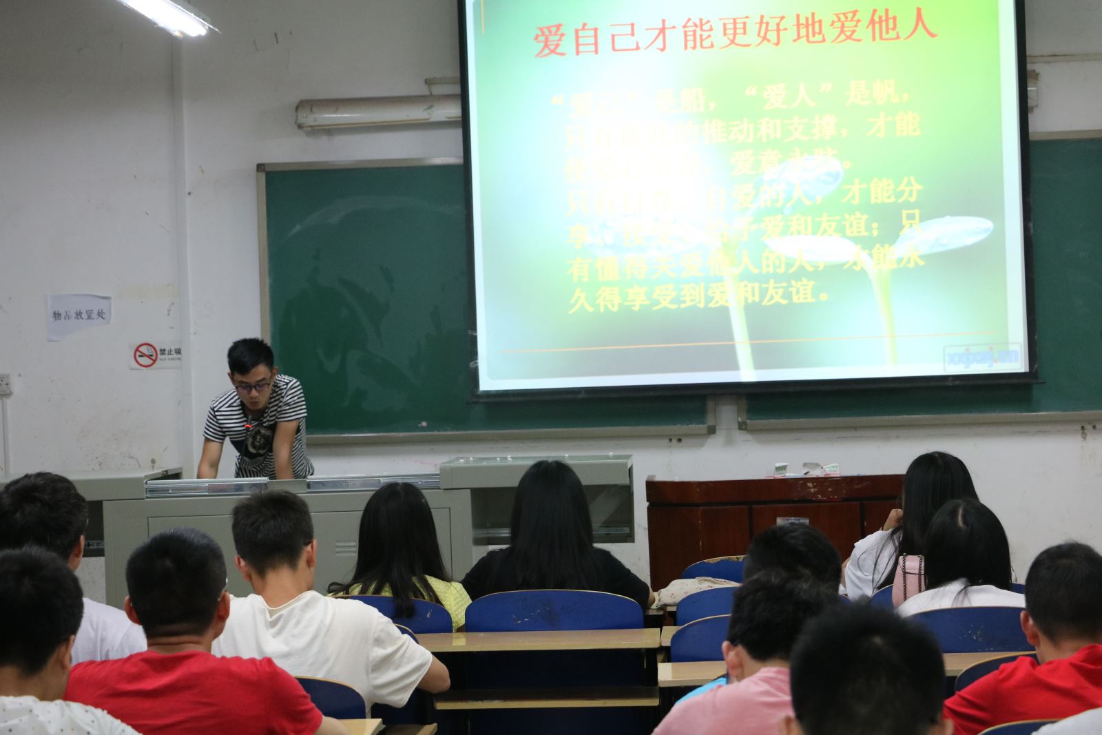 为了进一步提高同学的心理素质,培养良好的心理品质。5月22日晚7点30,化学化工公司大二、大一各班举行了我爱我——走出心灵的孤岛心理主题班会。