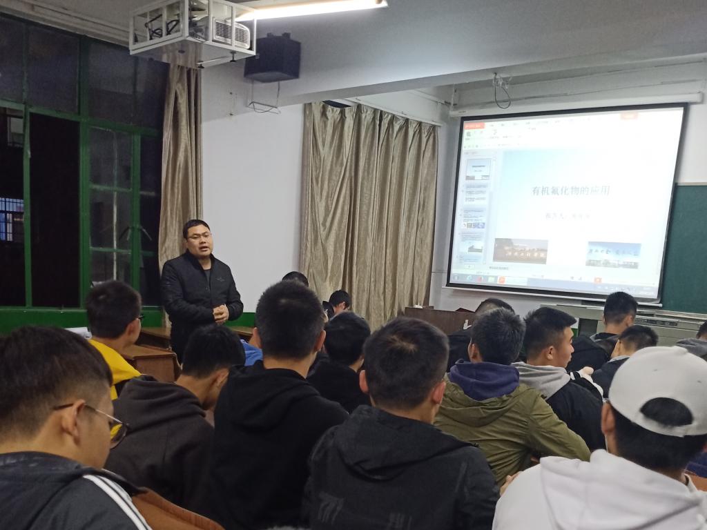 易年年博士作了题为“有机氟化物应用”的学术报告。含氟聚合物材料具有许多特殊性能,在化工、机械、电子电器、航天等领域获得及其广泛的应用。他向同学们介绍了两种有着重要地位的有机氟化物——聚四氟乙烯和氟树脂乙烯-四氟乙烯共聚物。前者享誉“塑料王”的称号,用于塑料的生产;而后者具有高强度、高透明度、防止雾滴凝聚等特性。