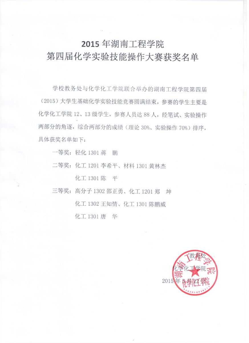 2015年伟德体育官方网站第四届化学实验技能操作大赛获奖名单
