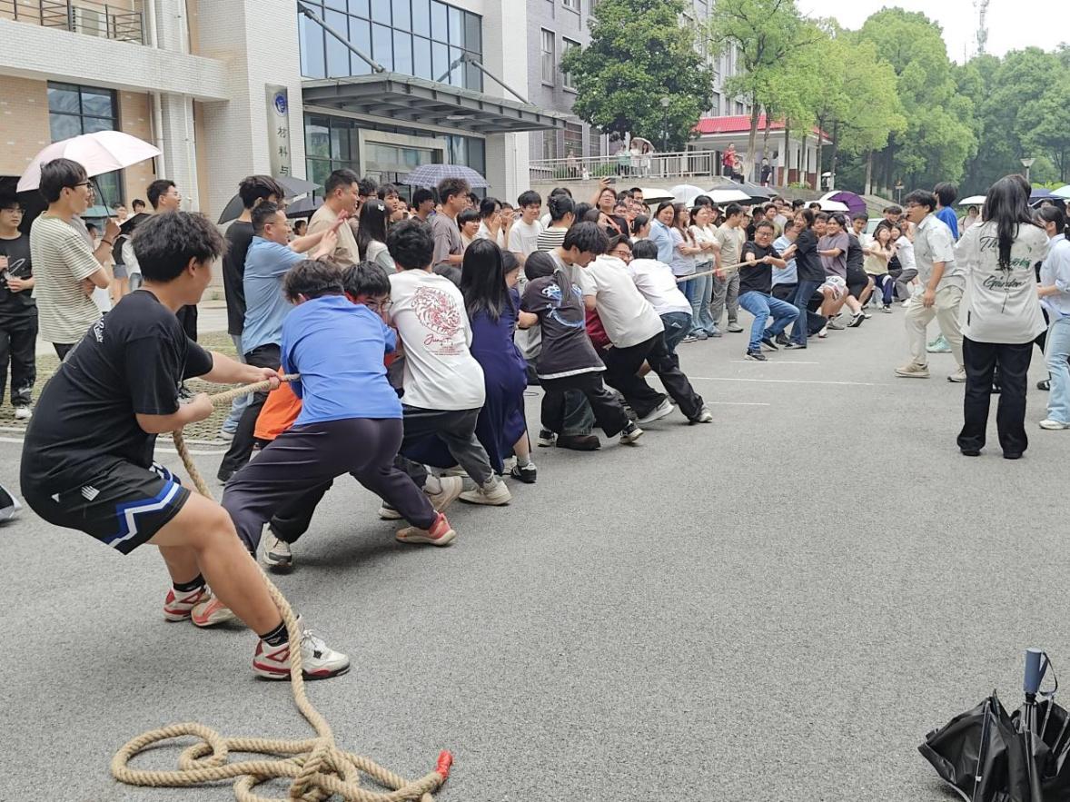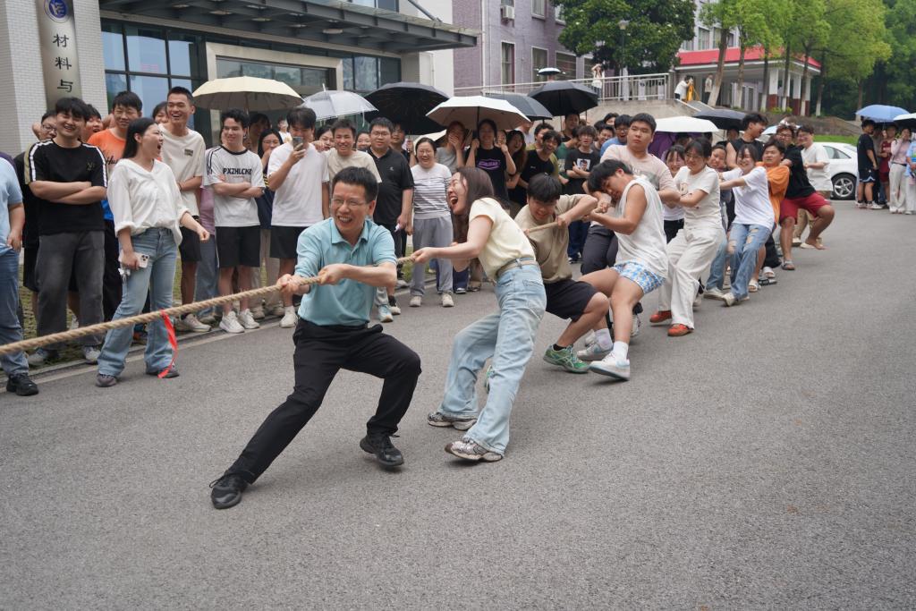 比赛现场气氛热烈,参赛师生配合默契。各代表队排兵布阵,教师们主动承担核心位置,与员工们共同紧握麻绳。随着裁判哨响,双方队员身体后倾、重心下移,在整齐的口号声中齐心协力。麻绳中央的红绸标记在中线两侧来回移动,场边观众的加油声此起彼伏,将比赛氛围不断推向高潮。