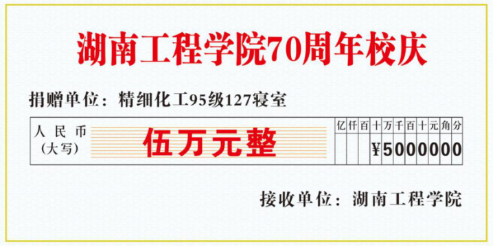 同窗情谊,相伴一生。寝室五个人自五湖四海相聚于湖工,在班主任杨辉琼的关怀下,他们逐渐建立起深厚友谊。毕业后,彼此之间经常相互关心、帮助,这份难能可贵的友谊一直延续到毕业二十余年后的今天。得知母校建校七十周年的消息后,他们想法一拍即合,决定以寝室为名义向母校捐赠,共同为母校献上最美好的祝福,“感谢母校!感谢老师!祝愿母校的明天更美好,更辉煌!”