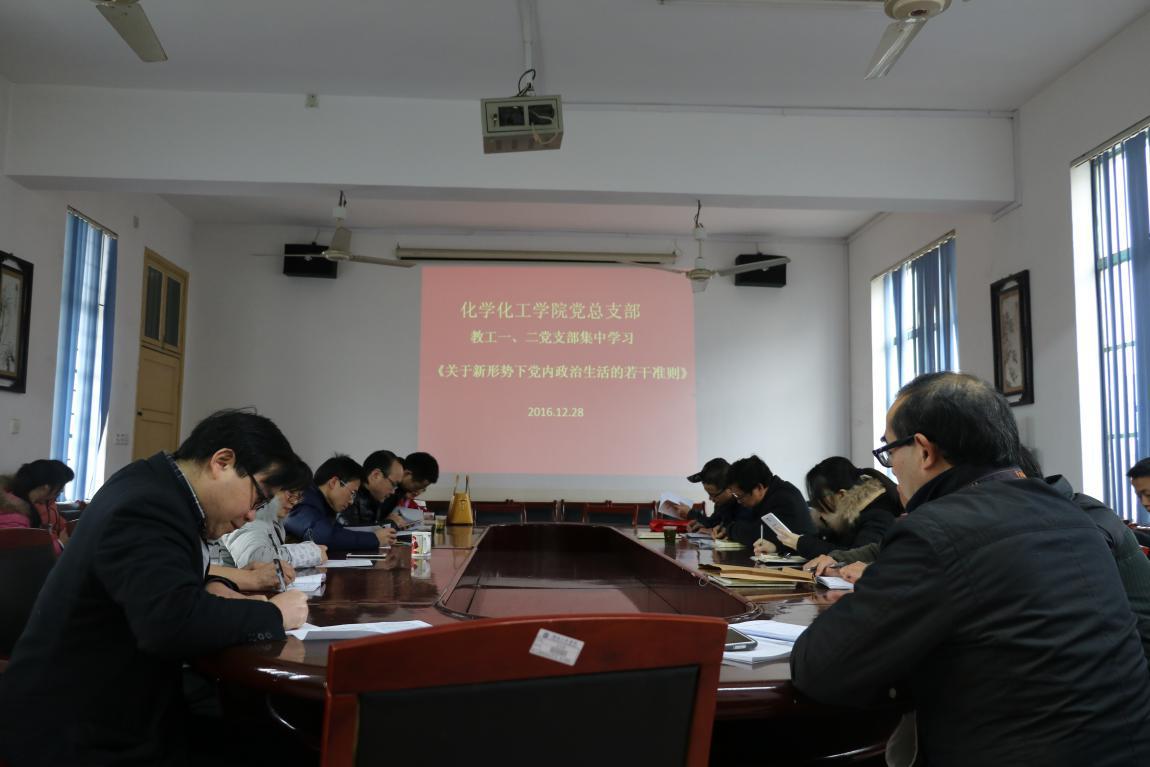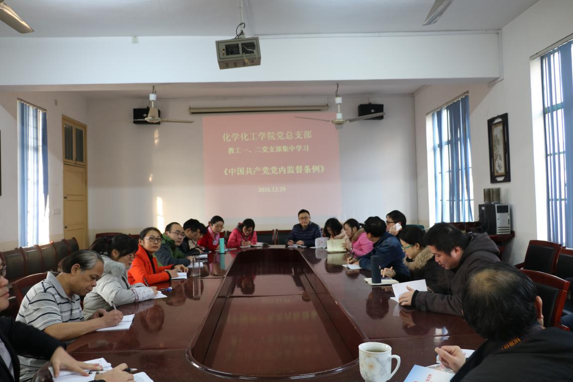12月28、29日,化学化工公司党总支部教工第一、第二党支部联合在四教306会议室组织召开全体教职工党员会议,集中专题学习习近平总书记系列重要讲话,《关于新形势下党内政治生活的若干准则》(简称《准则》)和《中国共产党党内监督条例》(简称《条例》),深刻领会十八届六中全会精神,并就学习贯彻落实提出明确要求,会议由化学化工公司党总支书记胡爱钦主持。