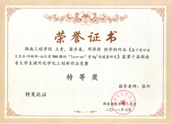 主持国家自然科学基金项目1项、湖南省自然科学基金项目3项、湖南省教育厅优秀青年项目1项,湖南省教育厅重点项目1项,参与“973”、“863”、“国家自然科学基金重大项目”、省自然科学基金、省发改委“创新引领”示范建设项目等10余项;申请国家发明专利18项,授权10项;发表论文50余篇,在Biosensors and bioelectronics、Sensors & Actuators B: Chemical、Microchimica Acta、Analytica Chimica Acta、分析化学等SCI期刊收录论文近30余篇,主编专著1部,参编教材1部,先后获得“湖南省化学化工学会青年化学化工奖”、伟德体育官方网站科技工作先进个人、“湖南省化学化工学会第十三届优秀论文一等奖”、“湖南省第十五届自然科学优秀学术论文二等奖”、“2011-2013年度和2015-2017年度湘潭市自然科学优秀学术论文一等奖”等奖项。